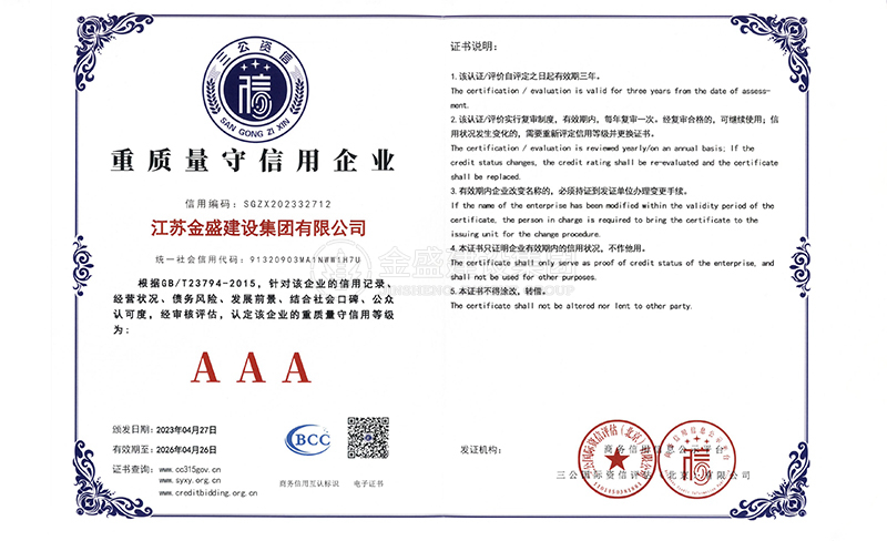 • 3A級資信等級證書